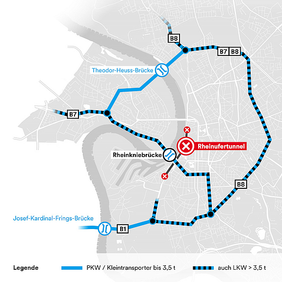 Die Nutzung des Umleitungsrings über die Theodor-Heuss-Brücke ist für Fahrzeuge über 3,5 Tonnen aufgrund der derzeitigen Ablastung leider nicht möglich.